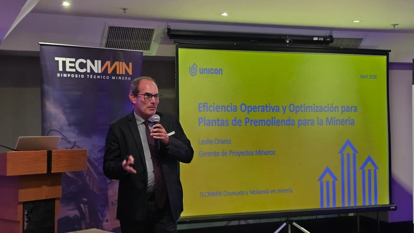 Leslie Orams, Gerente de Proyectos Mineros de UNICON, presentó durante el evento la ponencia «Eficiencia operativa y optimización para plantas de premolienda para minería».
